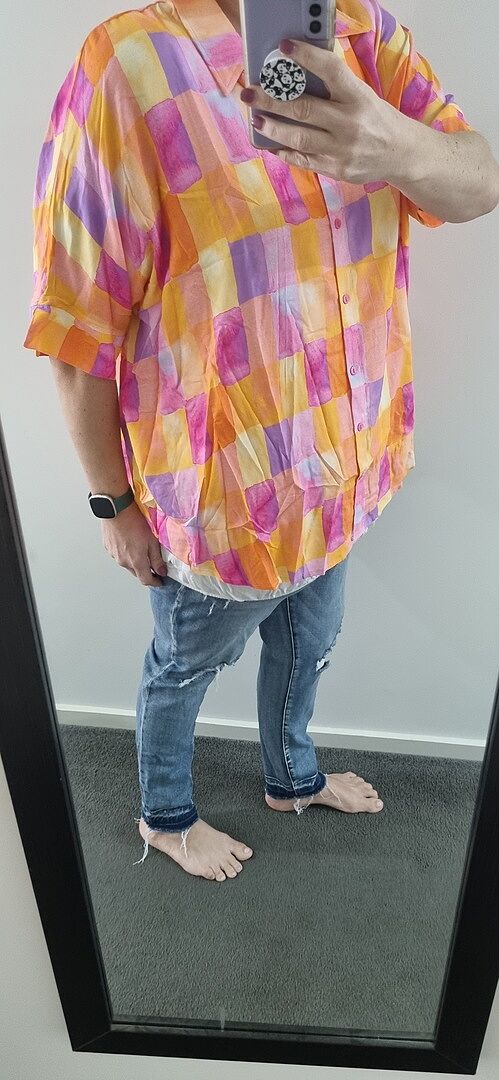 The colours and print are nice and vibrant. The fit is oversized and not a flattering shape however it is comfy for those warm days.