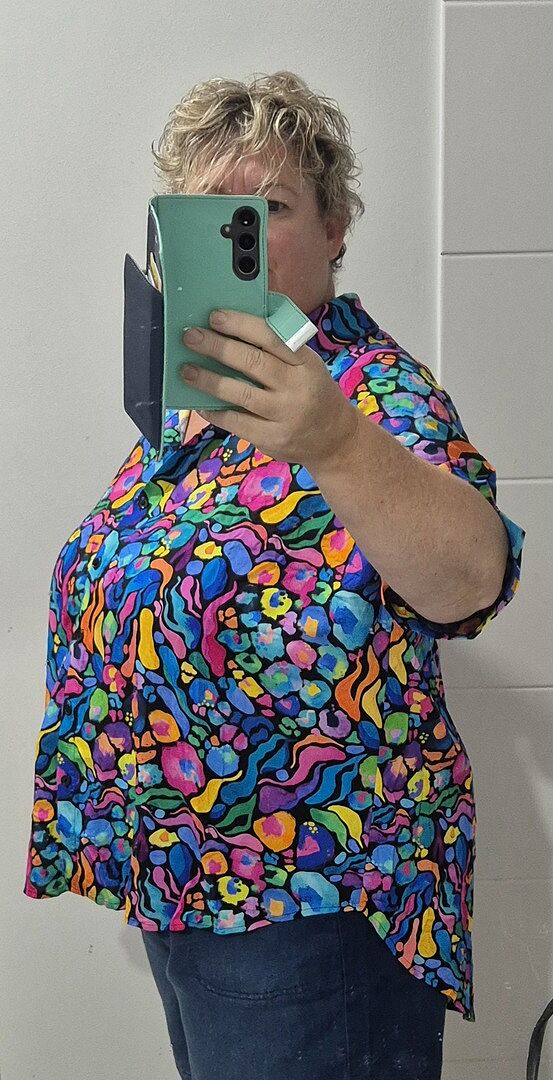 This shirt is so vibrant, the cut is perfect, the length means all the bits i want covered are covered. Sleeves are a great length. I sized down for a smaller amount of fabric. I got so many compliments wearing this to kids club, everyone loved it. So I told them all, that it's Proud Poppy, now open at our local centre.