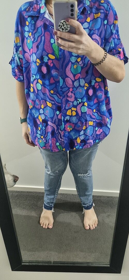 I love the Tammin shirts and own many. This print is really lovely and a little more subtle than some of the others, making it a good option for work. I wear as a normal shirt or undo the last few buttons and tie up, both look nice. The only downside I find is that it's too short for me, another 5cm or so and I'd be happier with the fit. I personally like shirts that cover my stomach as that's my self conscious area, so with all of the Tammin tops I always wear a long singlet underneath. I've attached a photo without a singlet so you can see the property length on my torso, and no, wouldn't recommend styling with pink trackies 😅